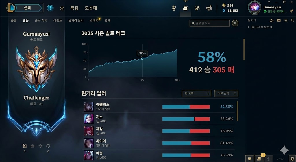 특히 2025 시즌에는 400승 이상을 기록하며, 안정적인 전적을 보여주었습니다. 다양한 상황에서 팀을 승리로 이끄는 그의 플레이는 솔랭에서도 여전히 강력한 영향력을 발휘하고 있습니다.